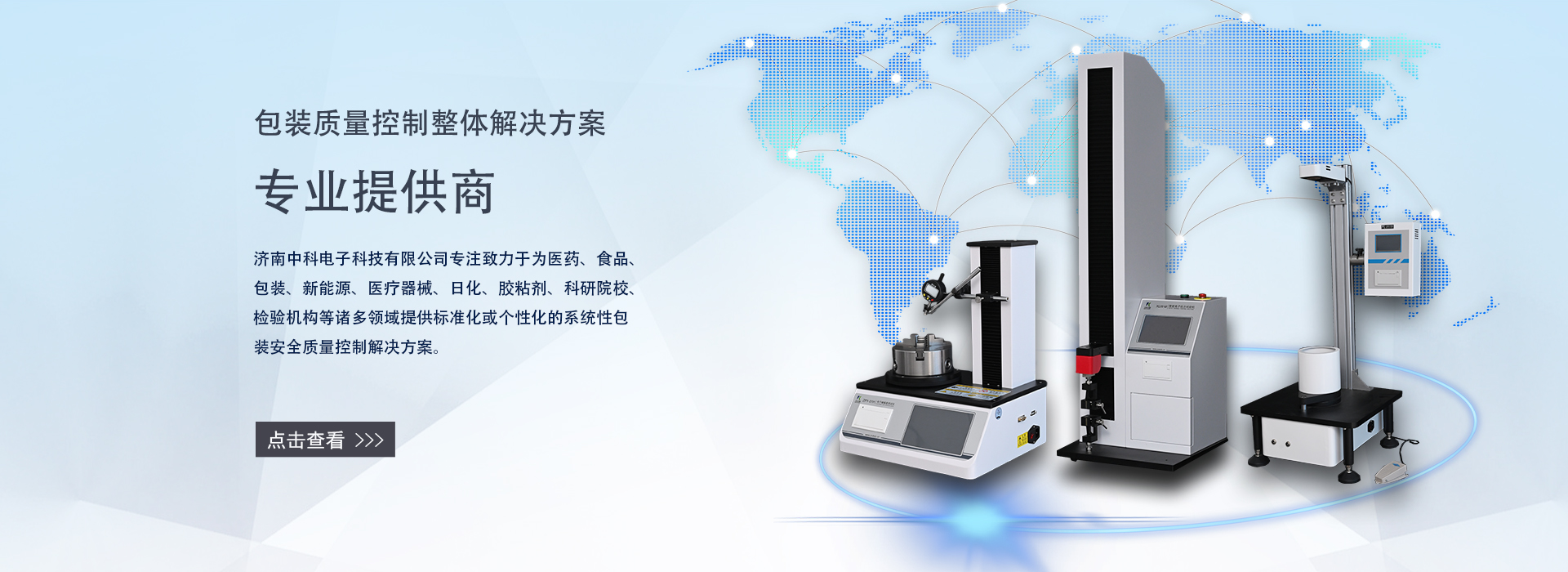 濟南中科電子科技有限公司是一家集包裝及膜材檢測儀器的研發、制造、銷售和服務為一體的專業科技公司。專注致力于為食品、醫藥、包裝、新能源、醫療器械、石化、日化、膠粘劑、科研院校、檢驗機構等諸多領域提供標準化或個性化的系統性包裝及膜材質量控制解決方案。